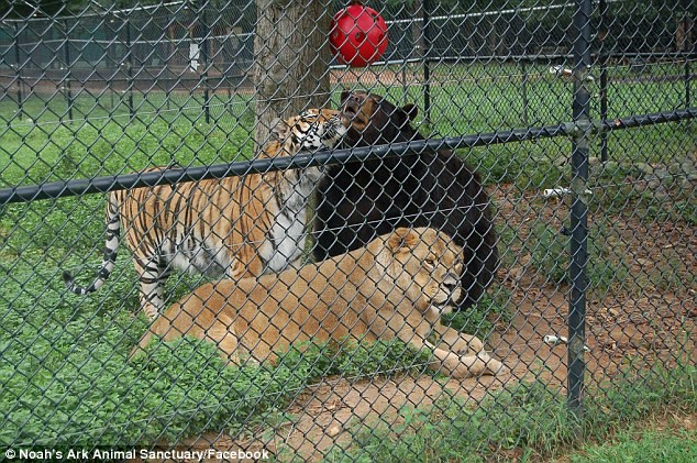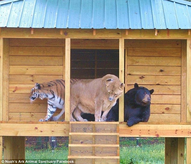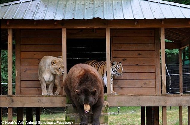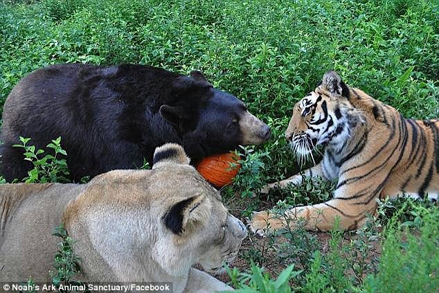 El oso Baloo , Leo el león y el tigre Shere Khan han forjado un vínculo inusualmente fuerte y ,hasta donde saben sus actuales cuidadores, son el único caso en el mundo de tres ejemplares de estas especies que conviven en un mismo habitáculo.