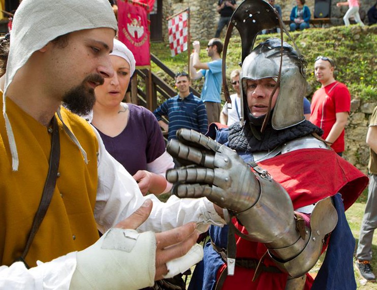 En las pausas entre los certámenes, marcadas por toques de corneta, los combatientes esperan que los artesanos medievales reparen sus armas o junto con el público gozan de platos preparados al estilo antiguo en la fortaleza.