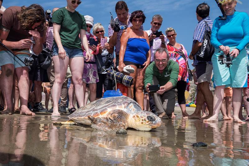 Gracias a su acción, Terri pudo volver al mar en la Playa del Inglés, rodeada de decenas de turistas que pasan sus vacaciones estos días en el sur de Gran Canaria y acompañada por otra tortuga de un año de vida, tan afortunada como ella, pero mucho menos famosa: de hecho no tiene nombre, se llama "126".